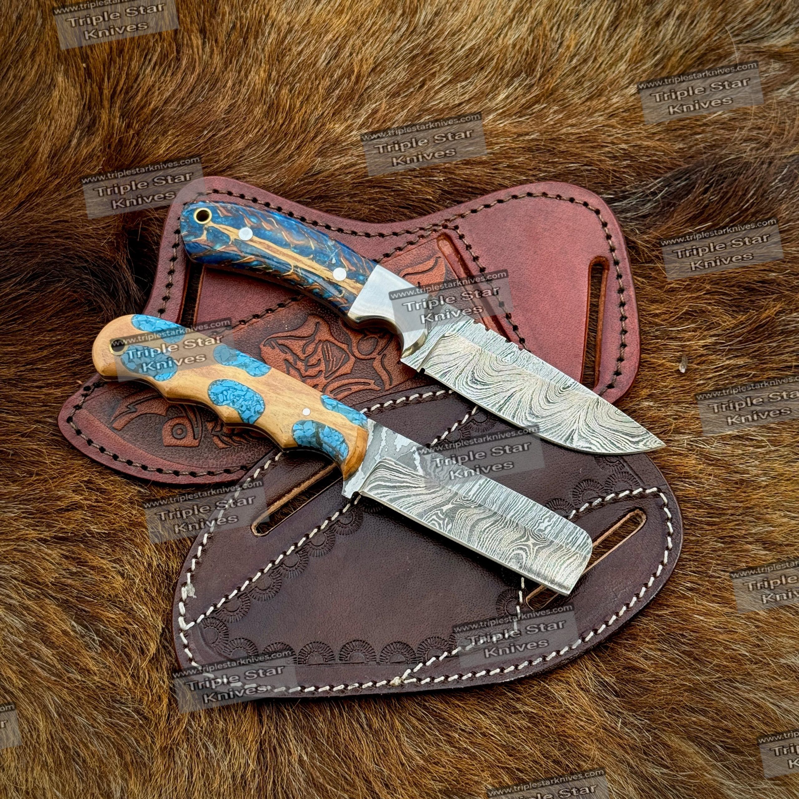 Custom made Damascus steel cowboy skinner and cutter knives with leather sheaths.