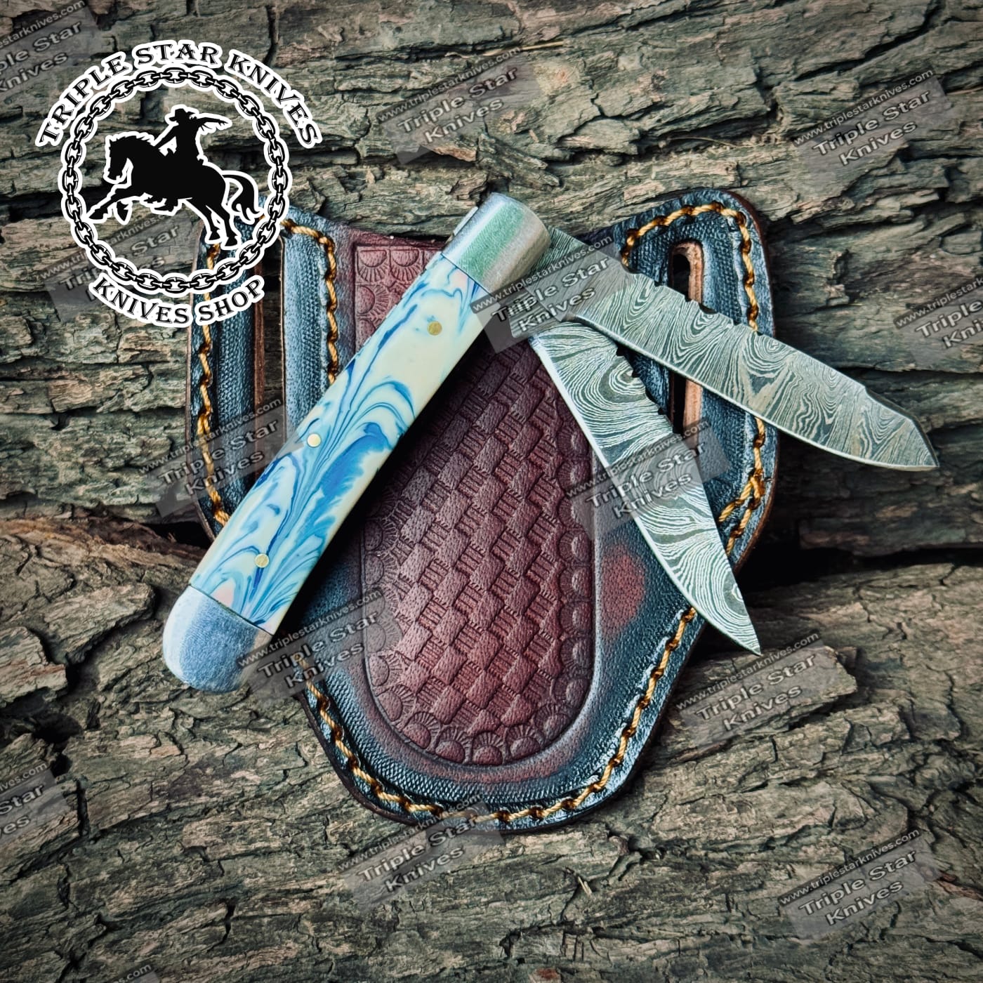 Custom Handmade Damascus Steel Trapper Pocket knife. With Handmade Leather Sheath…