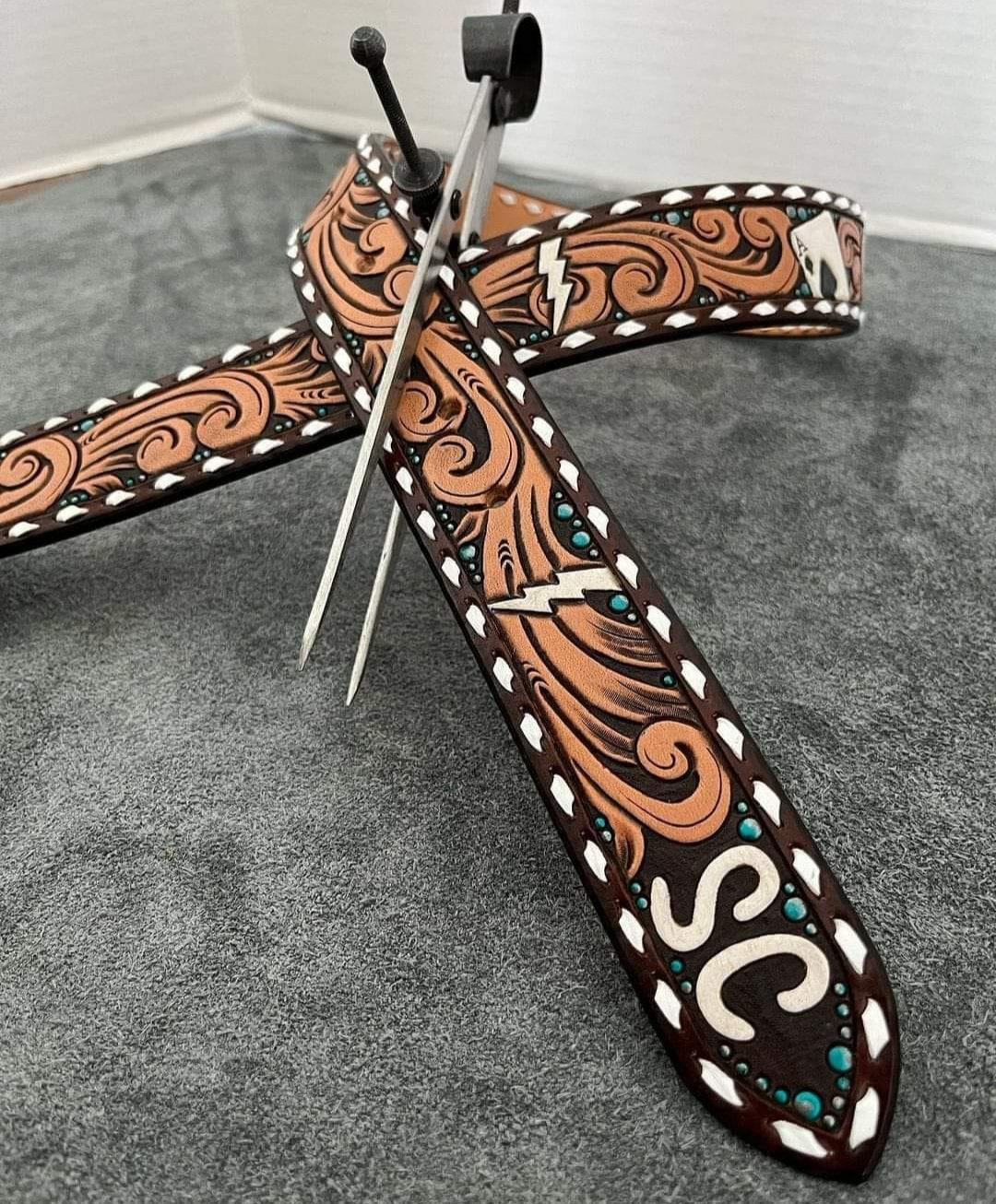 This belt is handmade and will last a lifetime. Hand cut and tooled. It is sealed with a water resistant sealer to protect it from everyday wear and tear. The belt is stitched with sturdy leather and has a stitched edge for added durability and strength.