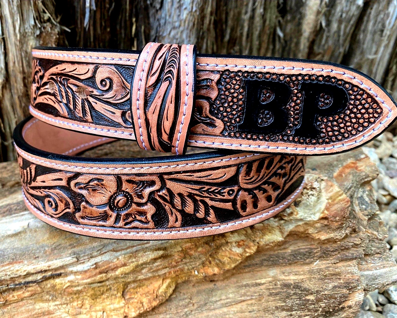 This belt is handmade and will last a lifetime. Hand cut and tooled. It is sealed with a water resistant sealer to protect it from everyday wear and tear. The belt is stitched with sturdy leather and has a stitched edge for added durability and strength.